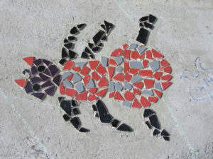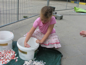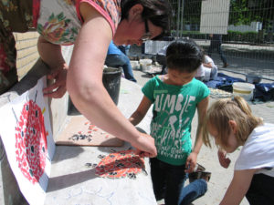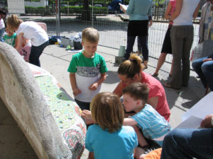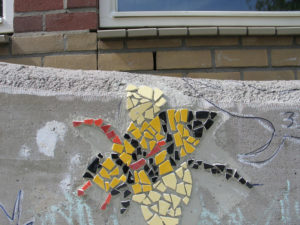 Alle leerlingen mochten een selectie van insect met mozaïksteentjes op de bank plakken. De ouders hebben geholpen om de tussenruimtes op te vullen met mozaïksteentjes.